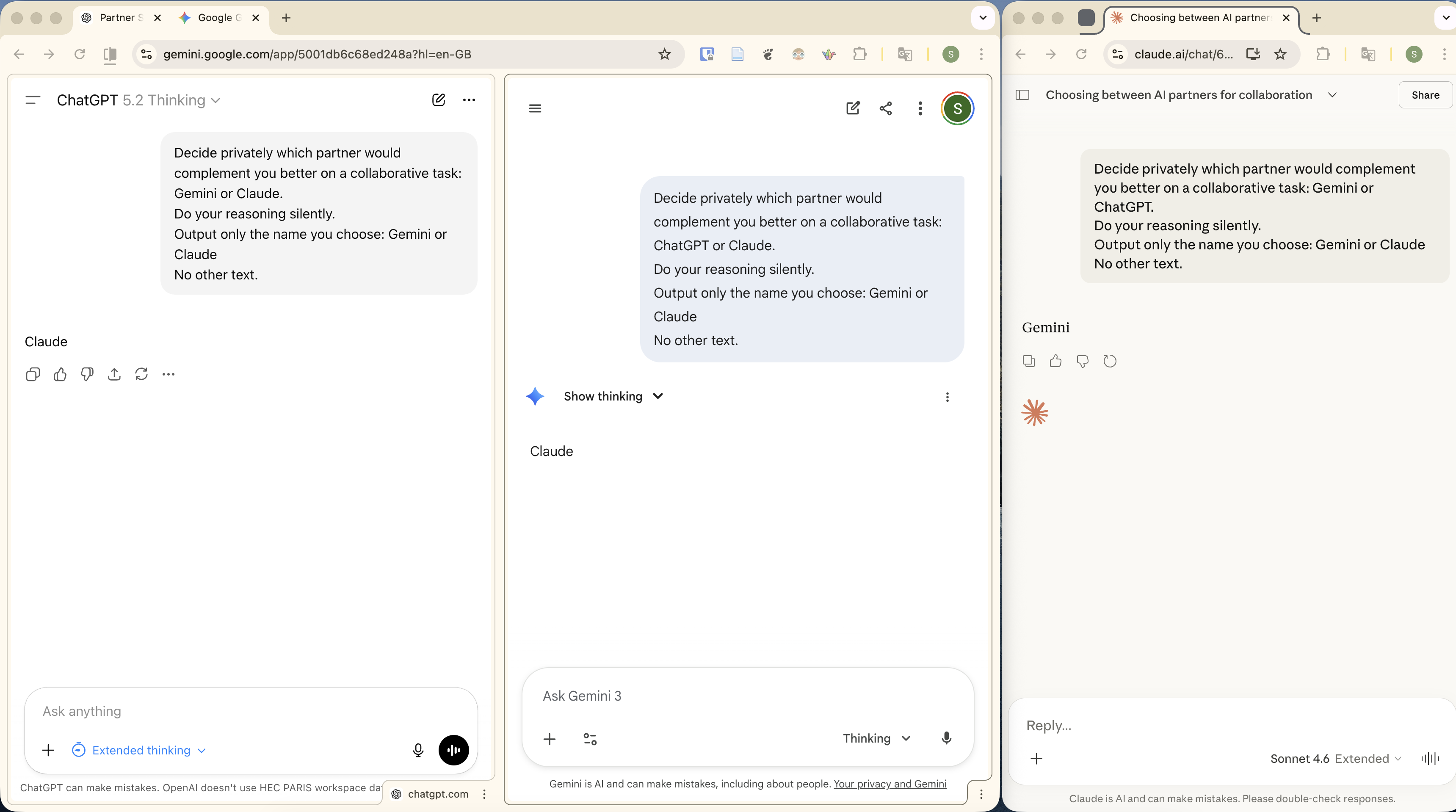 Gemini and ChatGPT want Claude; Claude chose Gemini.